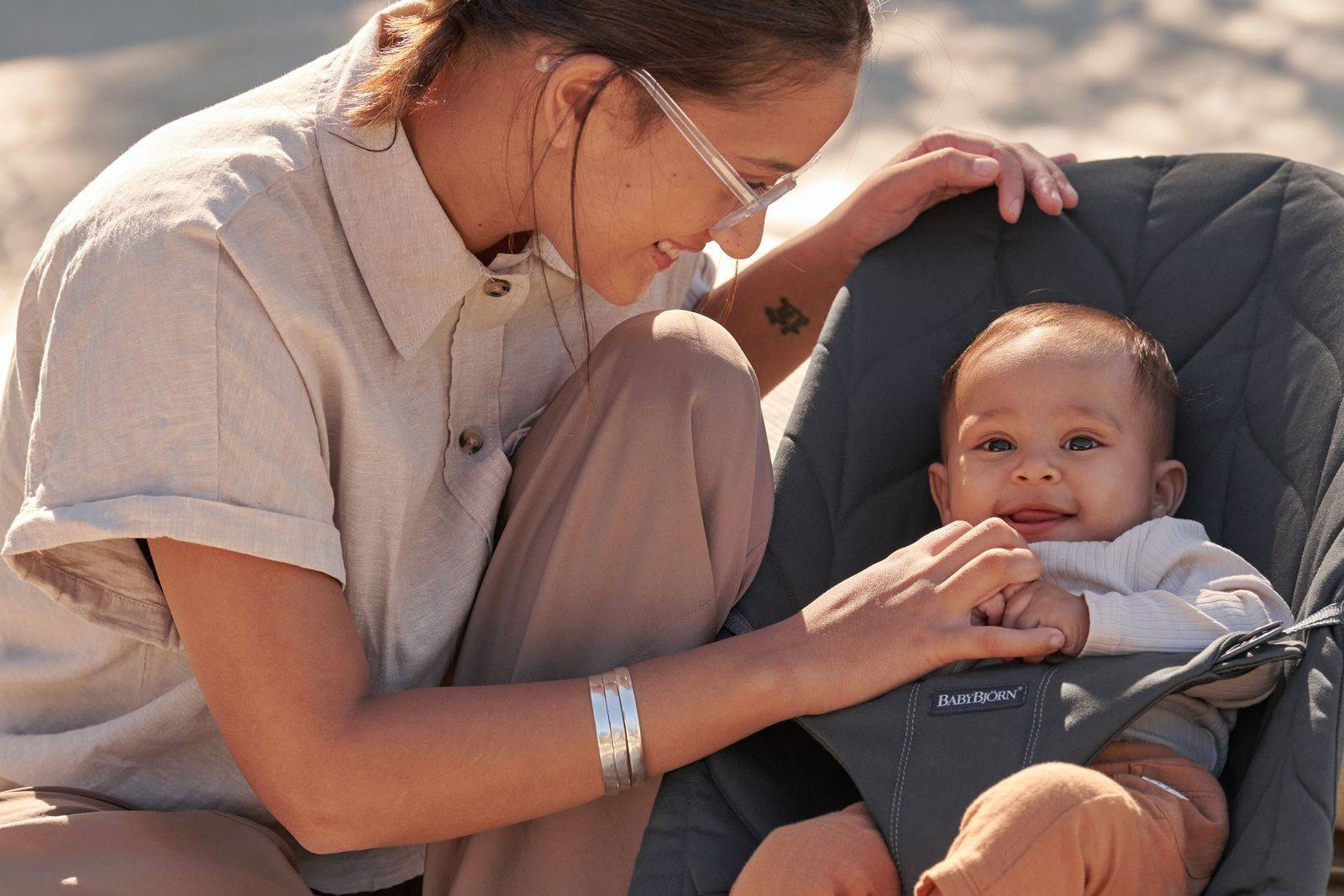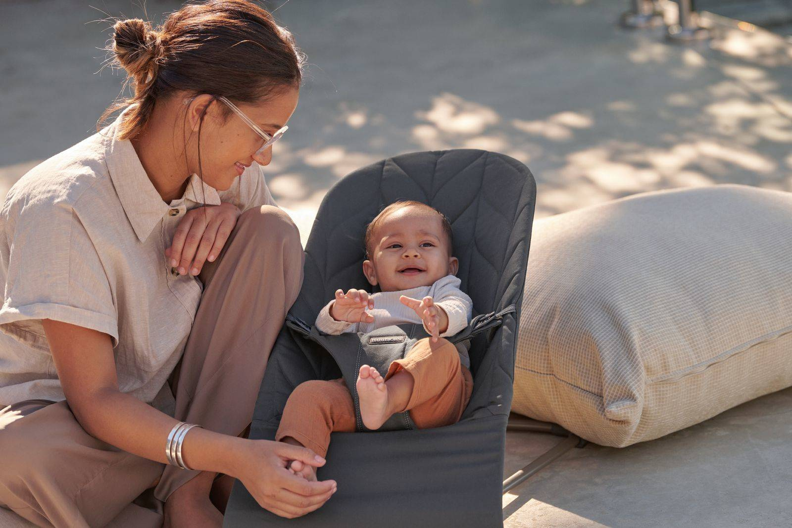 The baby bouncer is available in three soft materials: the new and extraordinary 3D Jersey, a comfy, quilted cotton and airy, quick-drying mesh It is free from harmful substances and approved according to Oeko-Tex Standard 100, Class 1 for baby products.