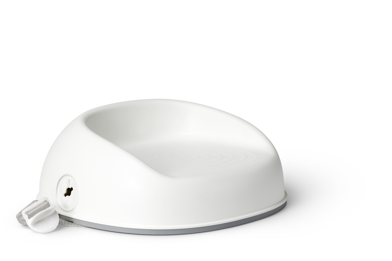 The booster seat rests firmly on the chair and is held in place by a sturdy strap. The strap has a childproof buckle for added safety. - Rubber strip for good grip