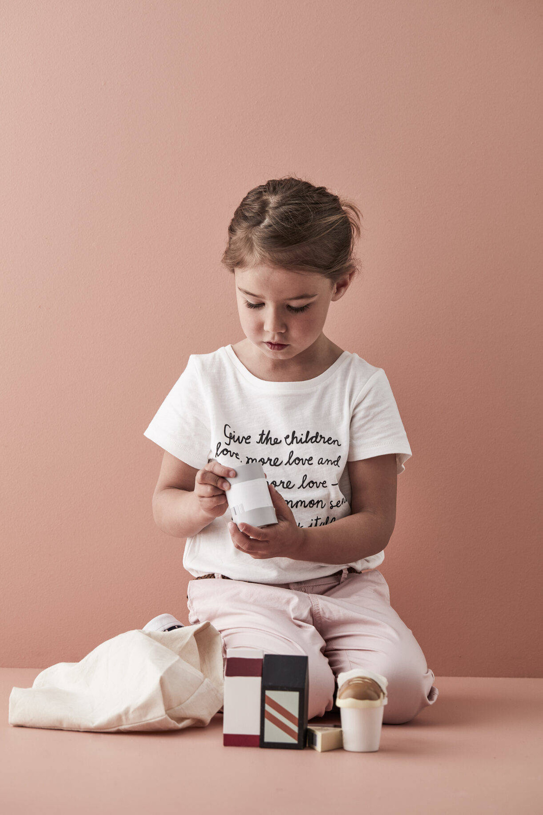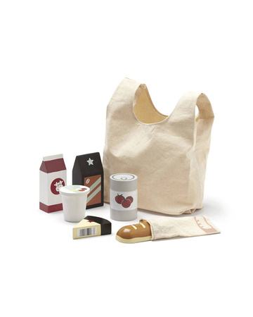 Do the weekly shopping with this grocery shopping set. The set is perfect for pretend play and comes with coffee, cheese, milk jar, ice cream jar, canned tomatoes, bread loaf in a cotton bag. Set out the products in the pretend shop, pay for the food and carry all the food home in the shopping bag. Includes 7 pieces. 1 coffee package, milk jar. canned tomatoes, packed ice cream with removable lid, cheese, bread with a cotton fabric bread bag. Shopping bag in 100% cotton.
