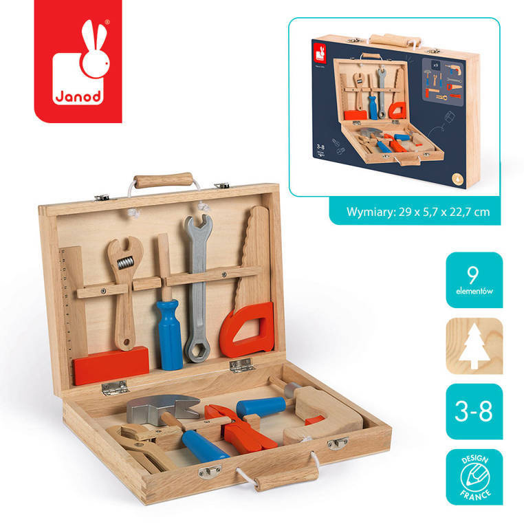 A wooden, fully equipped suitcase with tools of the French brand JANOD is the perfect gift for a small DIY enthusiast. Thanks to 9 wooden elements, the toy supports the child's development on many levels: it develops manual skills, patience, concentration, and also stimulates imagination and social skills, encouraging to play scenes imitating the behavior of adults. The set - apart from the suitcase - includes: a protractor with a ruler, a wrench, a screwdriver, a double-sided wrench, a saw, pliers, a hammer, pliers and a drill. Each of the tools has the appropriate place in the suitcase, which additionally teaches the child to order. Thanks to the handy size and handle, the whole thing is easy to carry.
