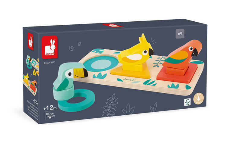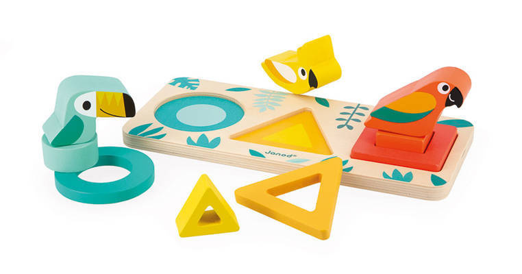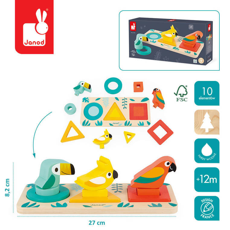 Wooden sorter The first shapes from the Tropic series by the French brand JANOD develops many key skills in a child, incl. distinguishing and matching shapes and colors and the so-called fine motor skills, moreover, it teaches concentration, perceptiveness and patience. In a wooden board with safe, rounded corners, there are three holes for wooden blocks in various geometric shapes - circle, square and triangle, and colors - turquoise, yellow and red-orange, respectively. A total of three elements can be placed in each hole - two blocks - one larger and flatter forming a frame, the other smaller and with a smaller hole, but taller, that fits in the center of the frame, and a bird-shaped block on the pin, matching the hole in the block the previous one. The toy impresses with its aesthetics and beautiful, intense colors.
