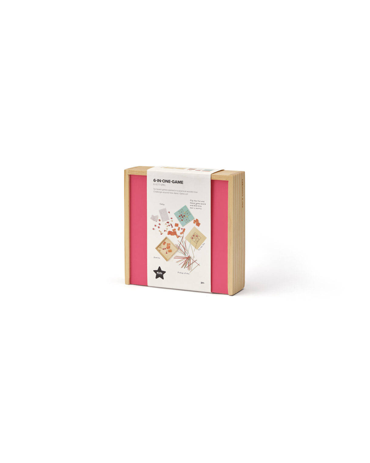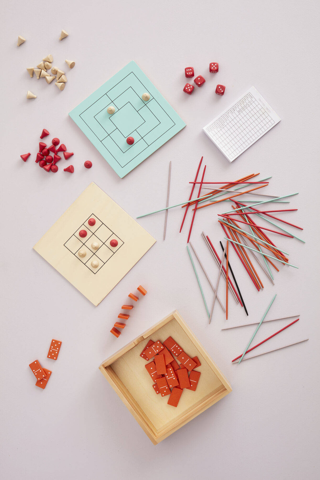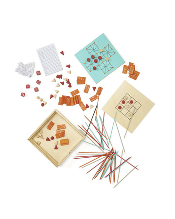 The wooden box contains six popular classic games: domino, pickup sticks, tic tac toe, yatzy, nine men´s morris, and the fox and geese game. Also includes five sets of dice and 40 game pieces: 20 in neutral and 20 in red.