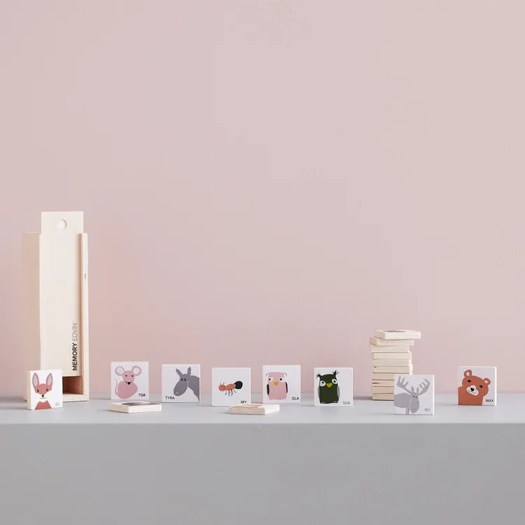 Classic memo game in FSC plywood with 10 different symbols from the Edvin series. Each animal has a short name – Ola the pink owl, Sus the green owl, Tor the mouse, Bo the moose, Max the bear, Stella the hedgehog, My the ant, Ed the fox, and Lo the lynx. Together they help your child learn to read and learn letters, while training their memory – where did you last see Bo the moose? Simple rules mean you can play again and again without getting bored. Playing this memory game is fun and educational and helps to train spatial and visual memory. Contains 20 pieces (10 pairs) in a wooden box for practical storage.