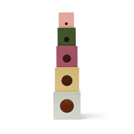 Stackable cubes in fine colors. In wood. Can be stacked on each other or inside each other. Can be sorted in order from smallest to largest and vice versa. Encourages logical thinking, exercises motor skills, coordination and can keep the child busy for several hours. Suitable for children of all ages. The smallest loves to pick in and out the cubes. Older kids can use them as houses for their toy animals or as storage boxes, the variations are endless. Each cube has a hole, that, when stacked inside each other forms a hole through them all.