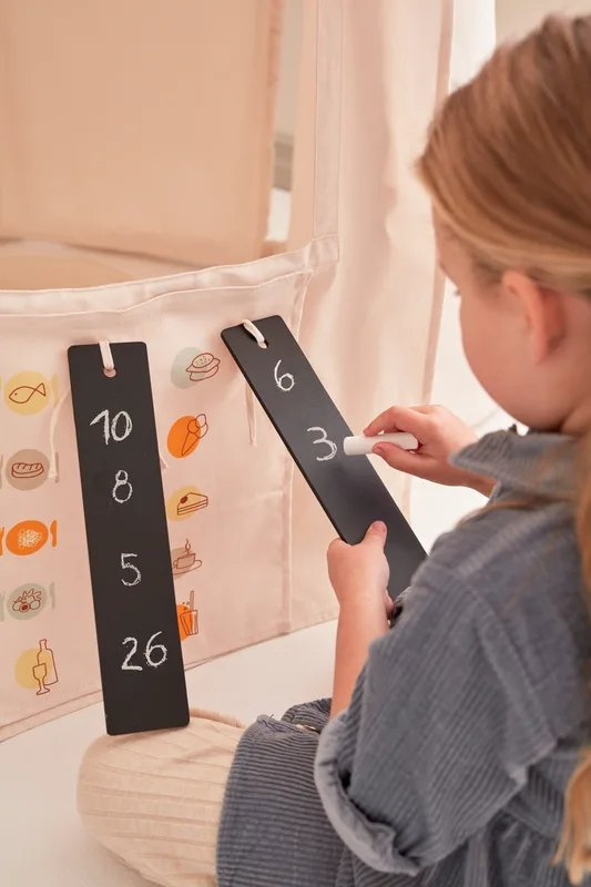 Do you want to run a restaurant or a yoga studio? Maybe you’d rather sell vegetables or hard wear? Only the imagination can stop the little entrepreneur with this add-on play set.  Easy to add to our playhouse or pavilion tent for even more creative play. Roll up the existing tent cloth and add the parts in the package. Choose between the included menus and attach them to the blackboards. Voila! The tent becomes a restaurant or a café. The package contains menus for a restaurant/café, a shop, a greengrocer, and a spa. The fabric matches our off-white tents.