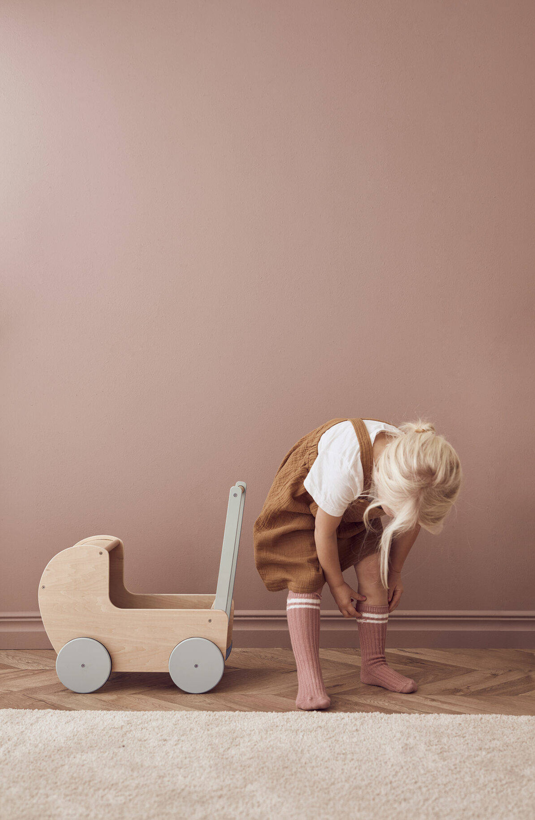 Drewniany wózek dla lalek z rączką i kółkami w kolorze zgaszonej zieleni. W zestawie prześcieradło i poduszka z białej bawełny. Wózek zachęca do odgrywania ról oraz do zabawy lalkami i miękkimi zabawkami. Koła mają gumowe zabezpieczenia, dzięki temu odgłosy jeżdżenia są stłumione, a wózek jest bardziej miękki i stabilny. Wózek sprawdzi się także jako wsparcie przy stawianiu pierwszych kroków.
