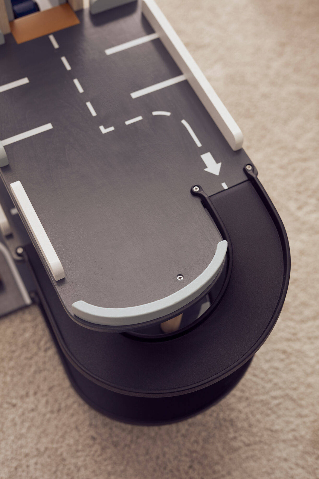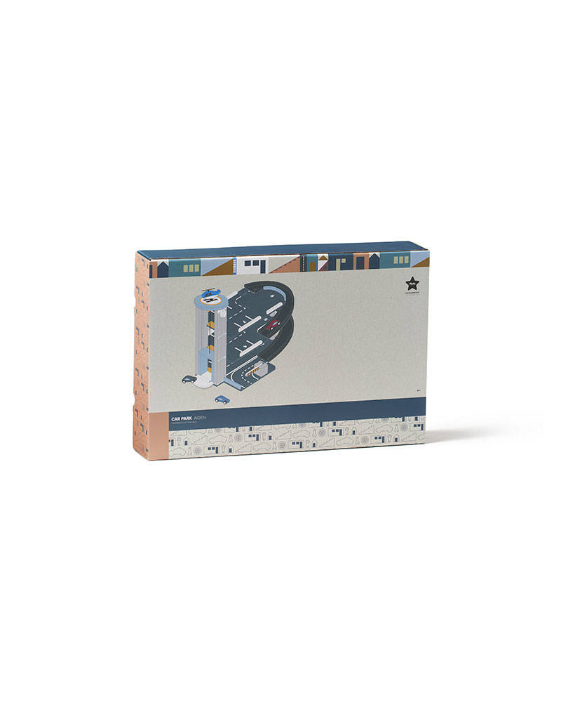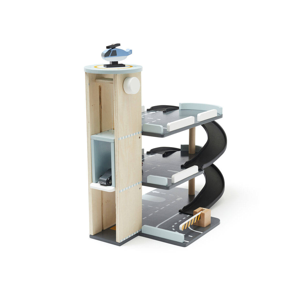 Wooden Garage play set, with three levels. It has everything your little one needs to create exciting adventures, speed up and down the ramps or take the wind-up lift to all levels, make sure to stop at the toll barrier, or buckle up and take the helicopter with it's own helipad. Included 3 cars 1 helicopter