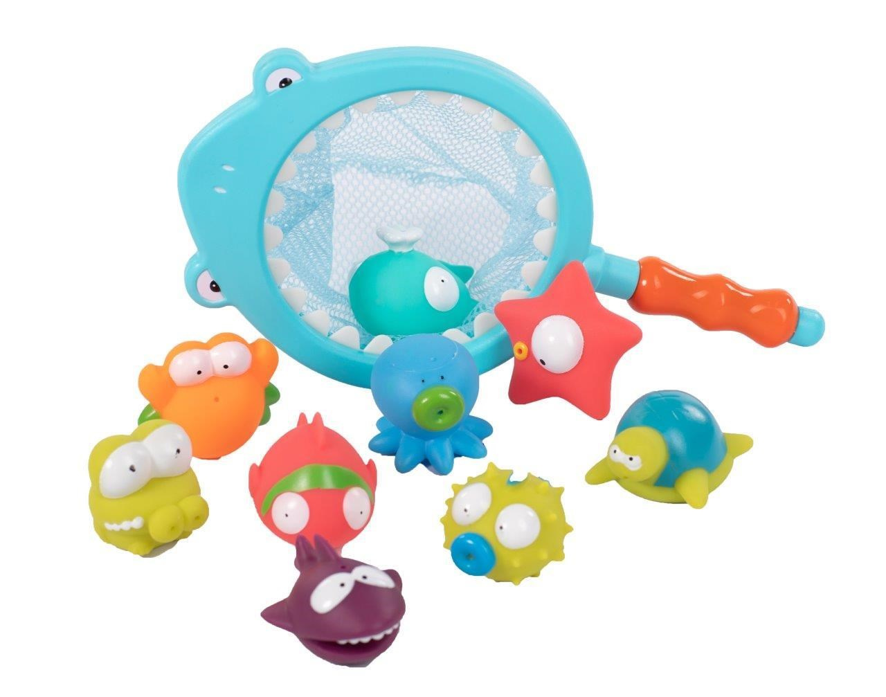 Ten niezwykle oryginalny zestaw zabawek do kąpieli składa się z siatki w kształcie rekina i 14 kolorowych zabawek gumowych i plastikowych.