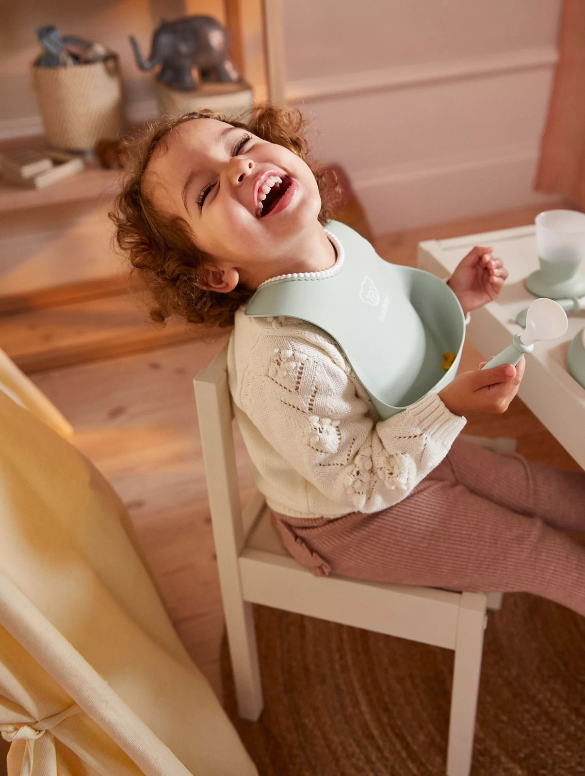 Dziecięcy śliniaczek – w który wpadnie wszystko to, co nie trafi do małej buzi – jest wykonany z elastycznego plastiku. Głęboka kieszonka zachowuje swój kształt, więc dziecko ruszając się i naciskając na nią, nie opróżni jej przypadkiem. Miękkie, regulowane zapięcie zapobiega otarciom oraz sprawia, że śliniaczek rośnie razem z dzieckiem.Śliniaczek możesz przetrzeć wilgotną tkaniną albo zmyć w zmywarce. Został on wykonany z szybko schnącego tworzywa, więc w krótkim czasie będzie ponownie gotowy do użycia. Śliniaczek jest przeznaczony dla dzieci, które skończyły cztery miesiące.
