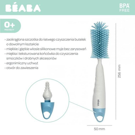 Silikonowa szczotka do butelek i smoczków francuskiej marki BEABA ma ergonomiczny kształt z zaokrągloną główką, co ułatwia dokładne czyszczenie butelek, pojemników, akcesoriów i ich zakamarków o dowolnym kształcie. Jej miękkie i giętkie silikonowe włosie zapewnia mycie bez zarysowań, a równie miękka, profilowana i dodatkowo teksturowana końcówka (chowana w dolnej części uchwytu) nadaje się idealne do precyzyjnego czyszczenia smoczków i innych drobnych akcesoriów. Wygodę użytkowania gwarantuje wydłużona rękojeść z otworem do zawieszania szczotki w kuchni. Szczotka jest łatwa do utrzymania w czystości, należy ją myć ręcznie. Kolorystyka charakterystyczna dla marki: biało-turkusowa.