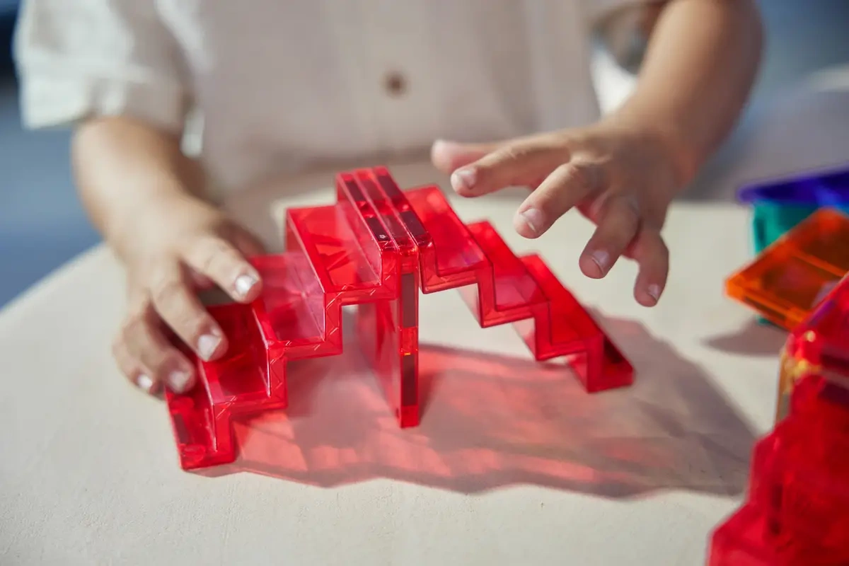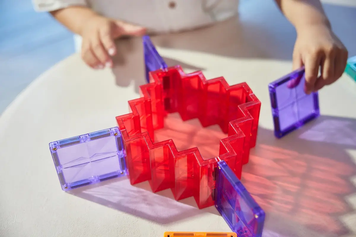 Zestaw zachwyca intensywnymi kolorami i przemyślanym designem – fasetowane powierzchnie pięknie odbijają światło, a solidne wykonanie zapewnia trwałość nawet przy codziennym użytkowaniu. Schody i dodatkowe elementy zachęcają do eksperymentowania z różnicami wysokości, równowagą i konstrukcją przestrzenną, wspierając rozwój wyobraźni, logicznego myślenia i zdolności manualnych.