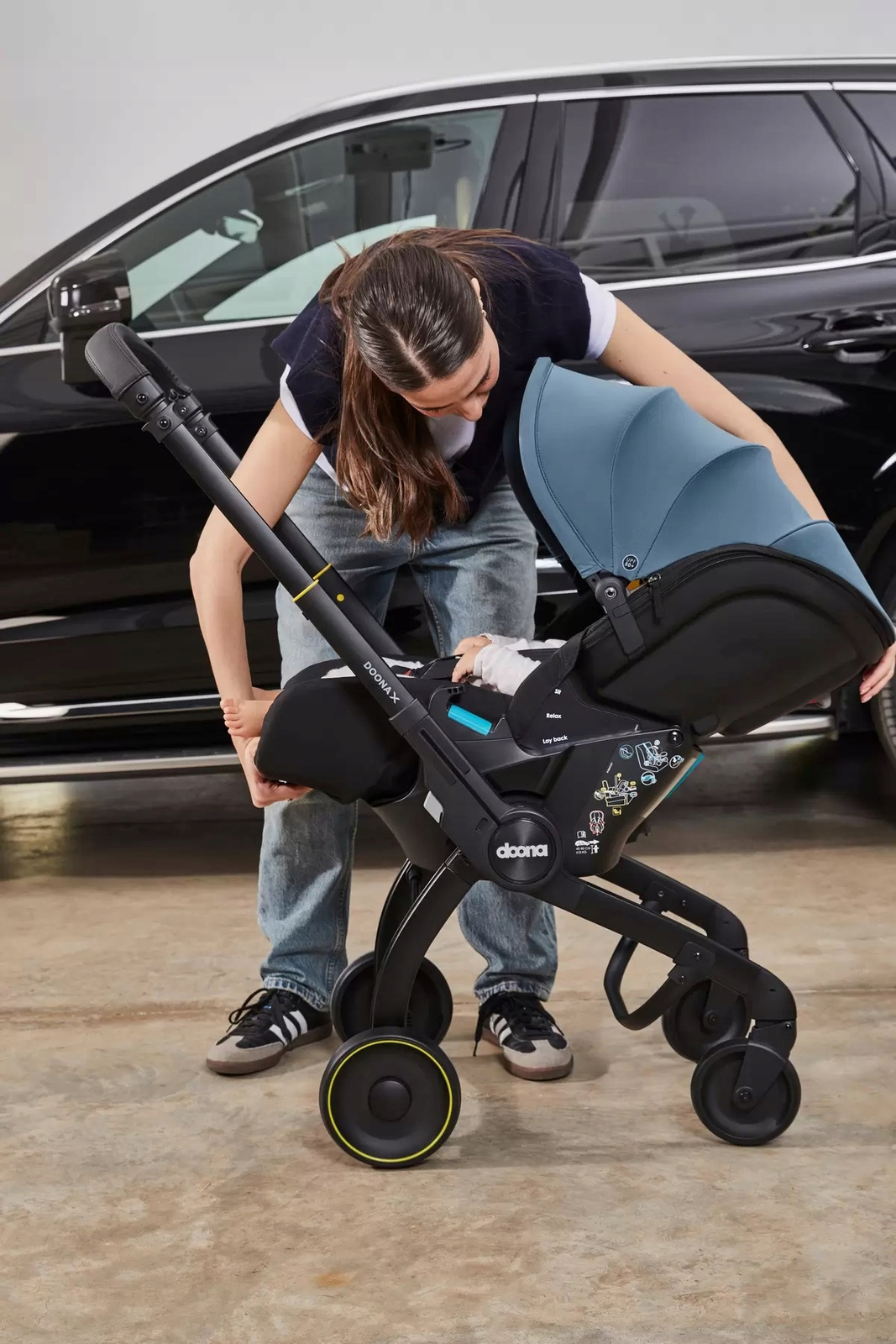 Doona X to w pełni zintegrowany system podróżny (samochodowy fotelik & wózek spacerowy w jednym)
