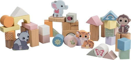 Zestaw składa się z 50 elementów, w jego skład wchodzą pastelowe klocki o różnych kształtach: kwadraty, prostokąty, trójkąty i zwierzątka: małpka, słonik, panda i tygrysek. Są doskonałe do tworzenia niepowtarzalnych budowli i ćwiczenia małej motoryki oraz gwarancją dobrej i rozwijającej zabawy dla dziecka.