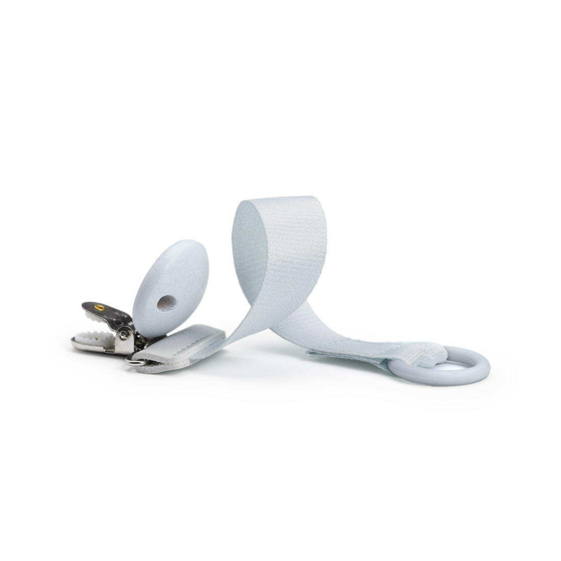 Elastyczny silikonowy pierścień można przymocować do niemal wszystkich smoczków dostępnych na rynku, a metalowy, niezawierający niklu klips do ubranka Twojego dziecka.