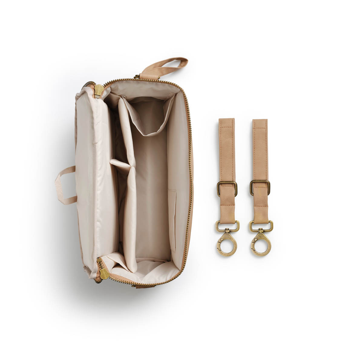 Wewnątrz klapy znajduje się mała pętelka, która umożliwia zawieszenie torby na haku ściennym w celu łatwiejszego i bardziej higienicznego dostępu do wszystkich rzeczy. Torba do wózka ma cztery mniejsze przegródki wewnątrz i dwie dyskretne kieszenie zewnętrzne na telefon, klucze i portfel.