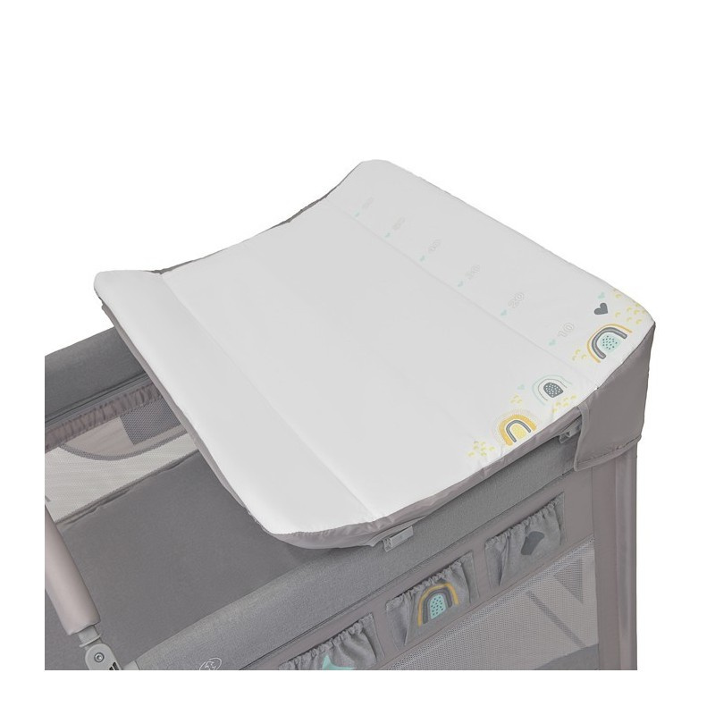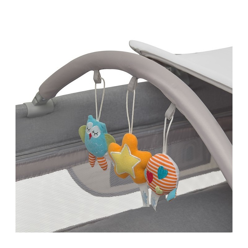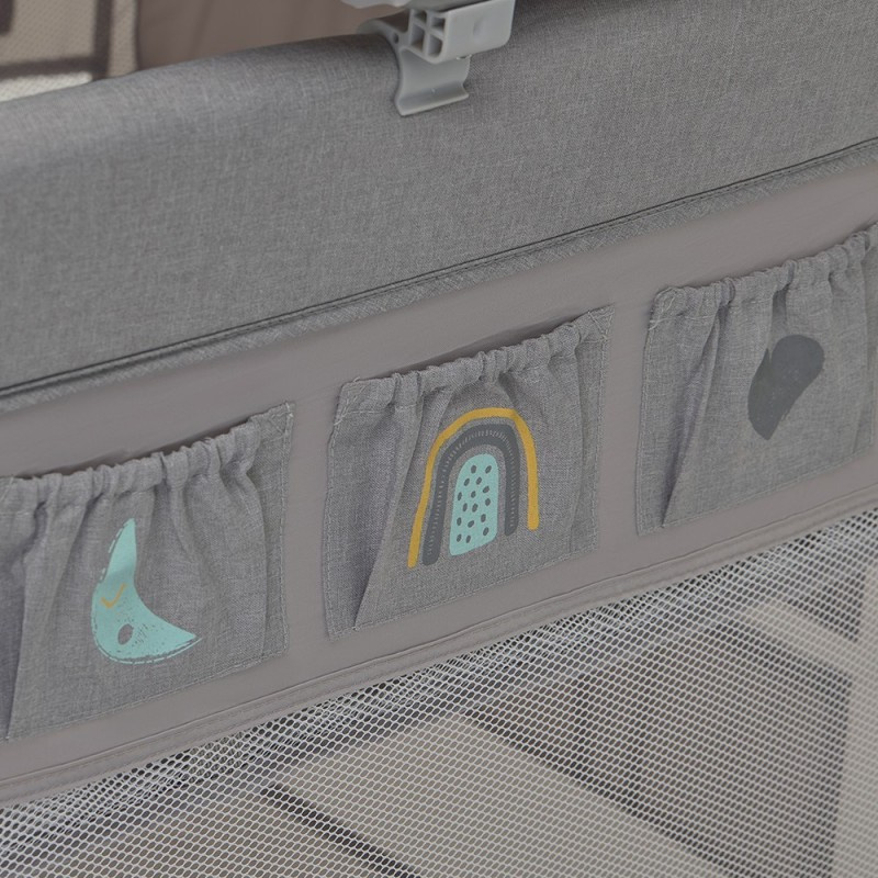 W zestawie znajdziesz również przewijak, pałąk z zabawkami oraz dodatkowe kieszenie na podręczne akcesoria.