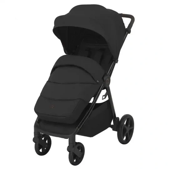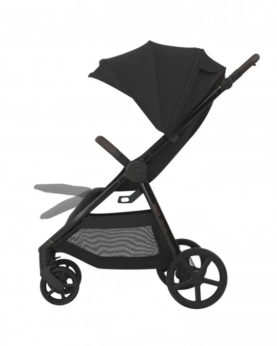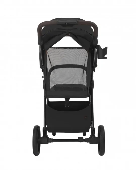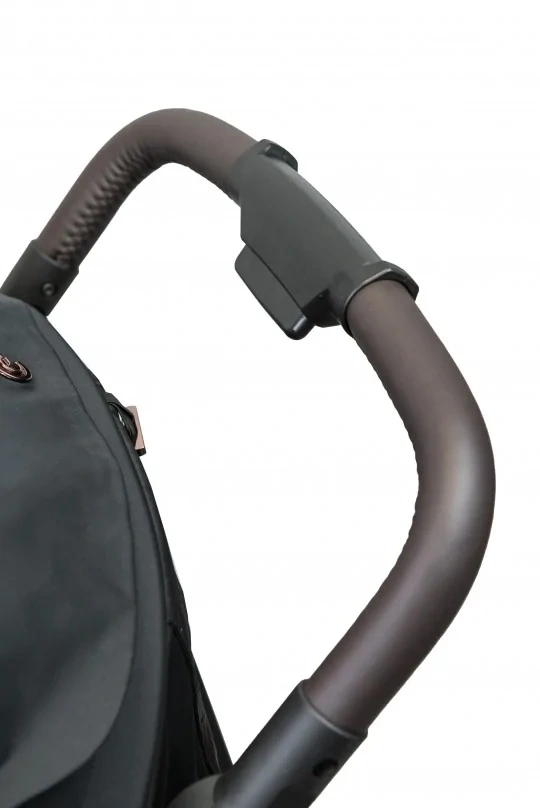 Czarna, połyskująca rama z miedzianymi akcentami nadaje wózkowi elegancki, nowoczesny charakter. Rączka wykończona brązową ekoskórą jest miękka w dotyku i pewnie leży w dłoni.Wysokiej jakości tkaniny z powłoką hydrofobową i filtrem UV50+ chronią dziecko przed słońcem i deszczem, a modne, ponadczasowe kolory sprawiają, że wózek przez długi czas wygląda jak nowy.