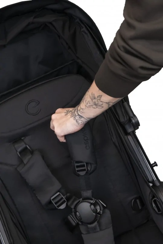 System one hand fold umożliwia szybkie złożenie wózka jedną ręką – idealne rozwiązanie, gdy drugą trzymasz dziecko.Po złożeniu wózek nie dotyka tapicerki do ziemi, a pasek na ramię i dodatkowy uchwyt ułatwiają przenoszenie po schodach lub do samochodu.