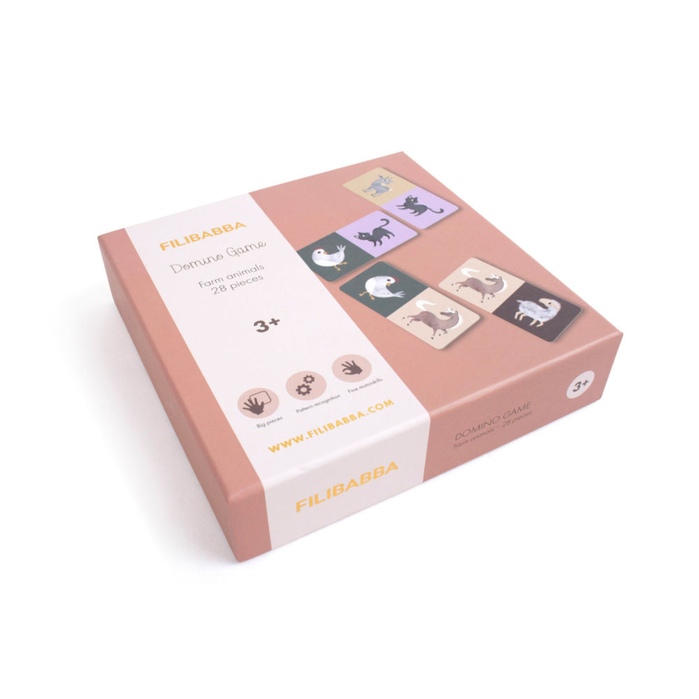 Gra domino zawiera 28 dużych elementów z kolorowymi, ręcznie rysowanymi ilustracjami przedstawiającymi urocze zwierzęta.