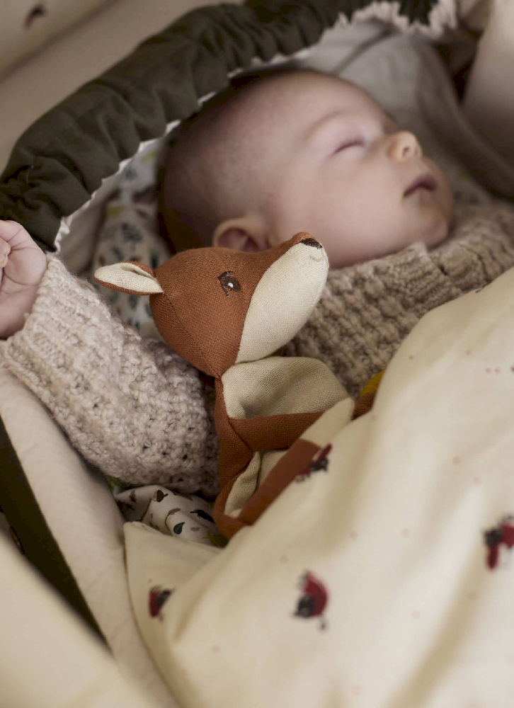 Subtelny, oddychający muślin jest super przyjemny w dotyku a dzięki jego delikatnym właściwościom przytulanka jest bezpieczna, nawet w dłuższym kontakcie z delikatną skórą dziecka.