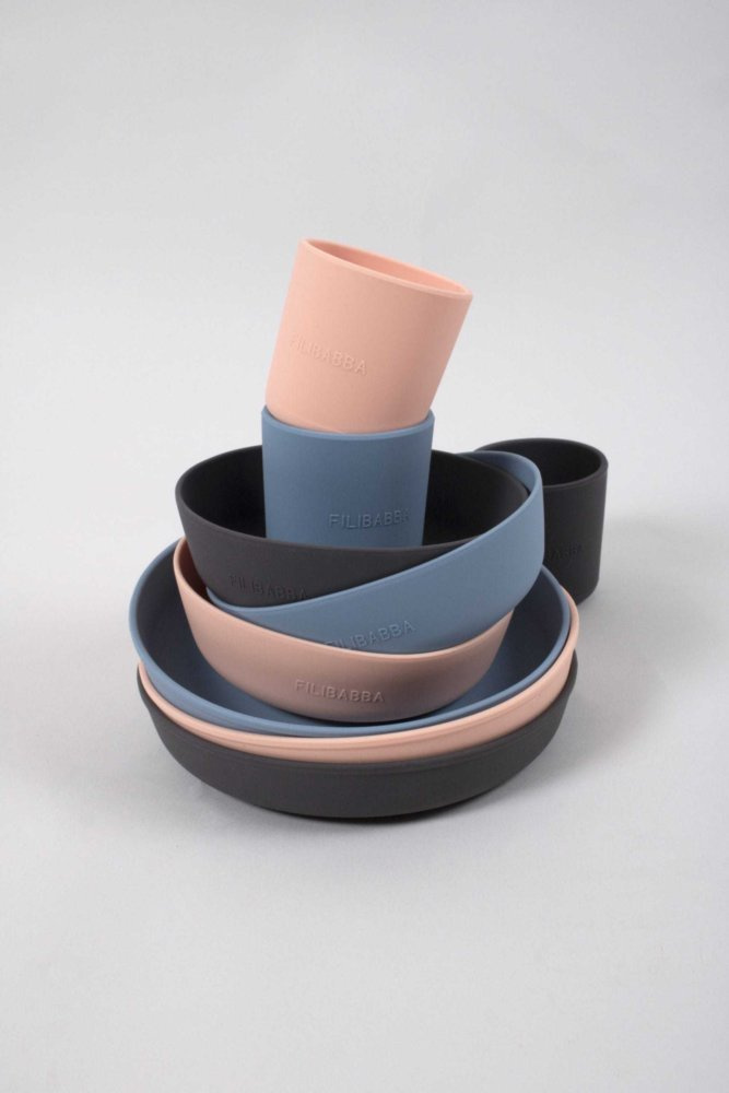 Silikonowy zestaw obiadowy składający się z talerzyka, miseczki i kubka. Miseczka i talerzyk posiadają przyssawkę pod spodem, dzięki której nie będą przesuwać się na stole czy tacce krzesełka do karmienia. Kubeczek został tak zaprojektowany by łatwo mogły go chwycić małe rączki dziecka. Zestaw sprawdzi się świetnie przy rozszerzaniu diety malucha. Minimalistyczna, stonowana kolorystyka wpasuje się w każde kuchenne wnętrze. Całość zapakowana jest w pudełko idealnie na prezent. Zestaw można myć w zmywarce.