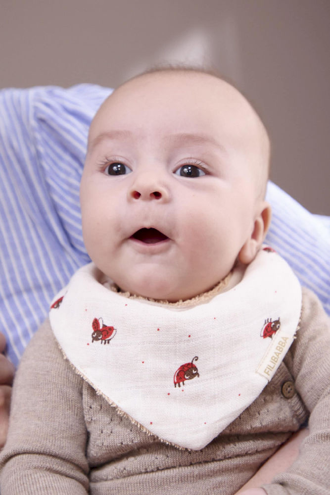Śliniak bandana wykonany jest z super miękkiego muślinu z bawełny organicznej z uroczymi nadrukami popularnych wzorów Filibabba. Tył podszyty jest puszystą i bardzo chłonną bawełną frotte.