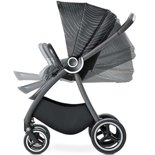Wyjątkowo szeroki zakres regulacji pochylenia oparcia pozwala na zajęcie przez dziecko komfortowej leżącej pozycji. Innowacyjny, łatwy w użyciu system wymiennych akcesoriów pozwala na szybki montaż gondoli lub fotelika - przemyślany, komfortowy Travel System.