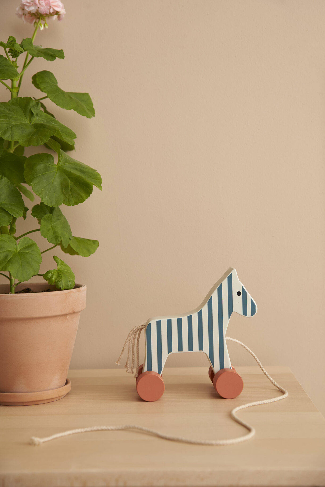 Drewniany konik do zabawy z kolekcji Carl Larsson ze sznurkiem o długości 60 cm.