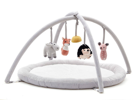 Mięciutka mata dla niemowląt z pluszowego materiału, z pałąkami i odpinanymi wesołymi zwierzętami.