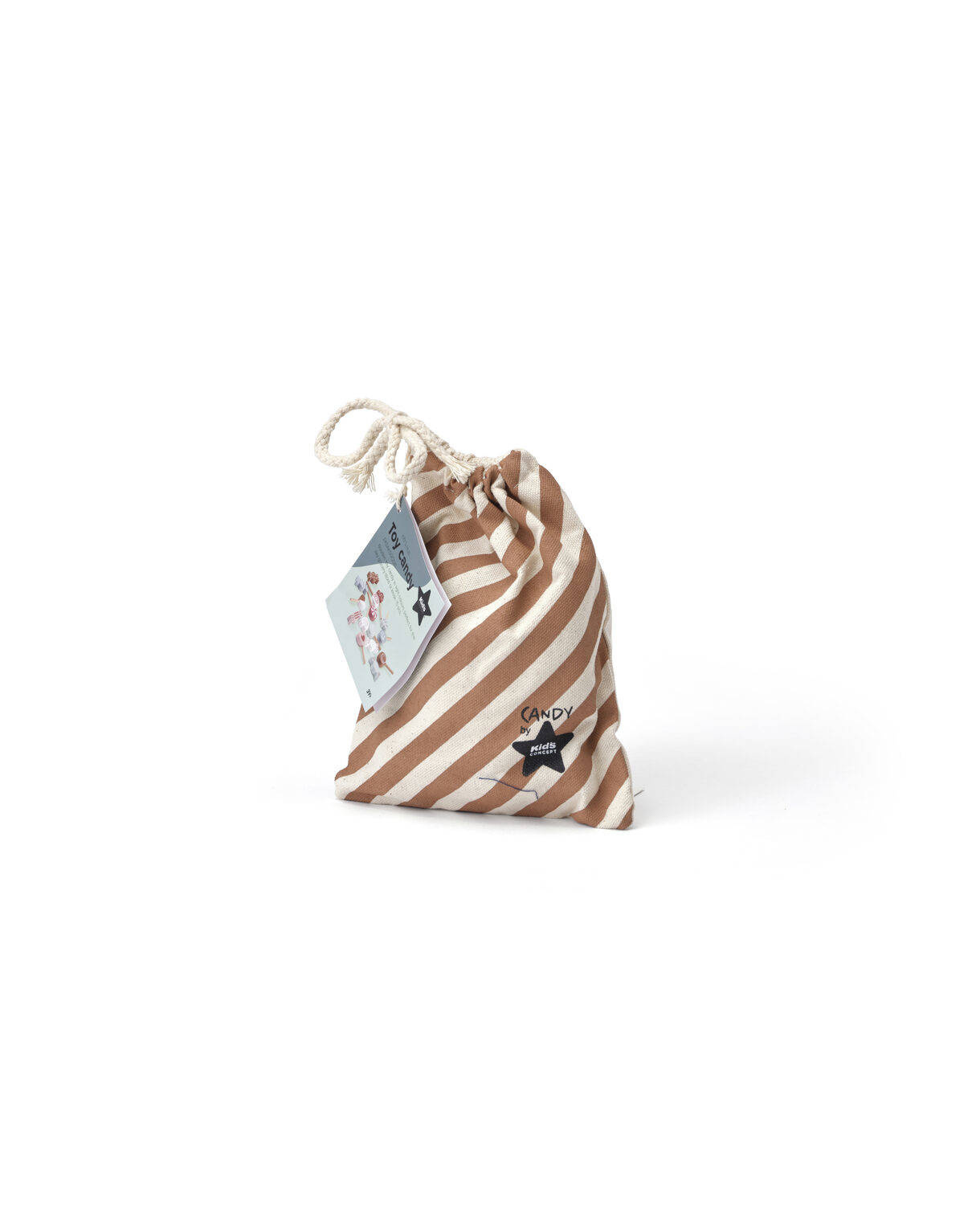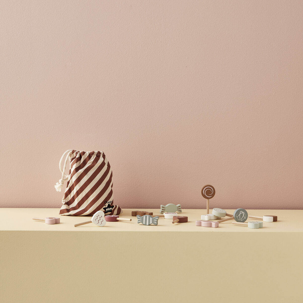 Cukierki do zabawy, wykonane z drewna. Zestaw zawiera 15 cukierków i torbę do przechowywania o wymiarach 15 x 20 cm.