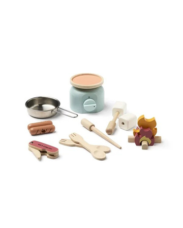 W skład naszego zestawu z kuchenką kempingową wchodzi gazowa kuchenka, patelnia, drewniane ognisko z 3 „płomieniami”, dwa kije do grillowania, dwie pianki, dwie kiełbaski, sztućce turystyczne (połączenie łyżki i widelca, 2 szt.) oraz scyzoryk. Gdy zechcesz posmakować kempingowych specjałów, na kijki do grillowania nałóż pianki albo kiełbaski. Nie będzie to trudne, ponieważ otwór w piankach i kiełbaskach pasuje do kijków. Pieczenie nad ogniskiem to świetna zabawa. A jeśli chcesz coś usmażyć, ustaw płomienie na kuchence.