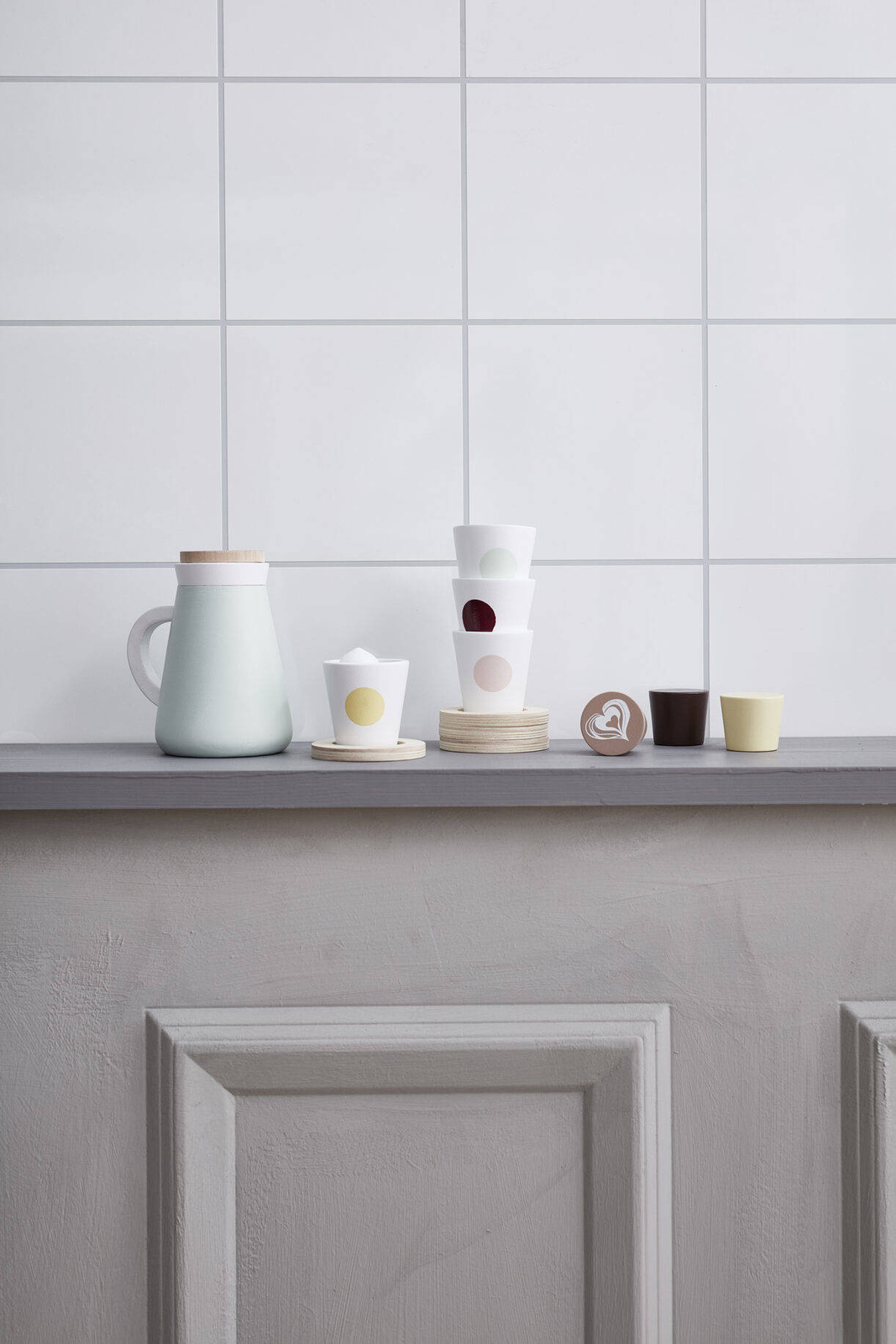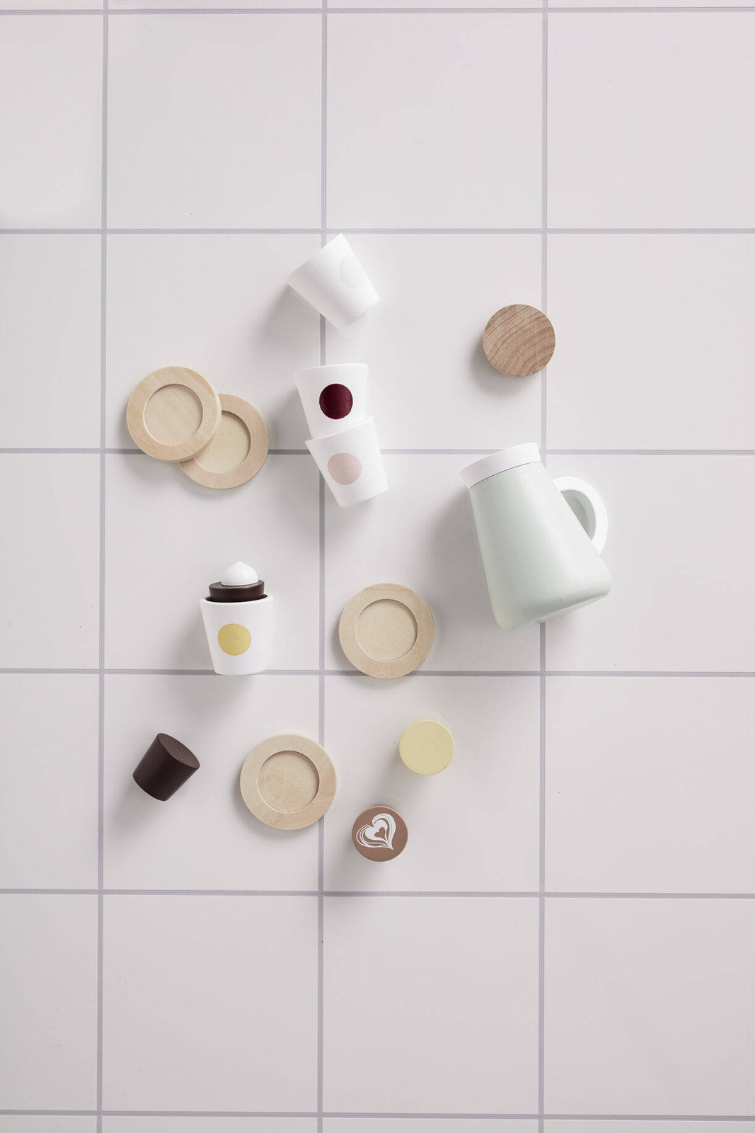 Ten drewniany zestaw FIKA zawiera termos ze zdejmowaną pokrywką, 4 różne kubki i cylindryczne klocki-napoje, które pasują do kubków. Masz do wyboru czarną kawę, cafe au lait, gorącą czekoladę z bitą śmietaną i herbatę. Napełnij kubki różnymi napojami i zrób sobie z przyjaciółmi przerwę na kawę, lub zaproponuj coś do picia mamie i tacie.