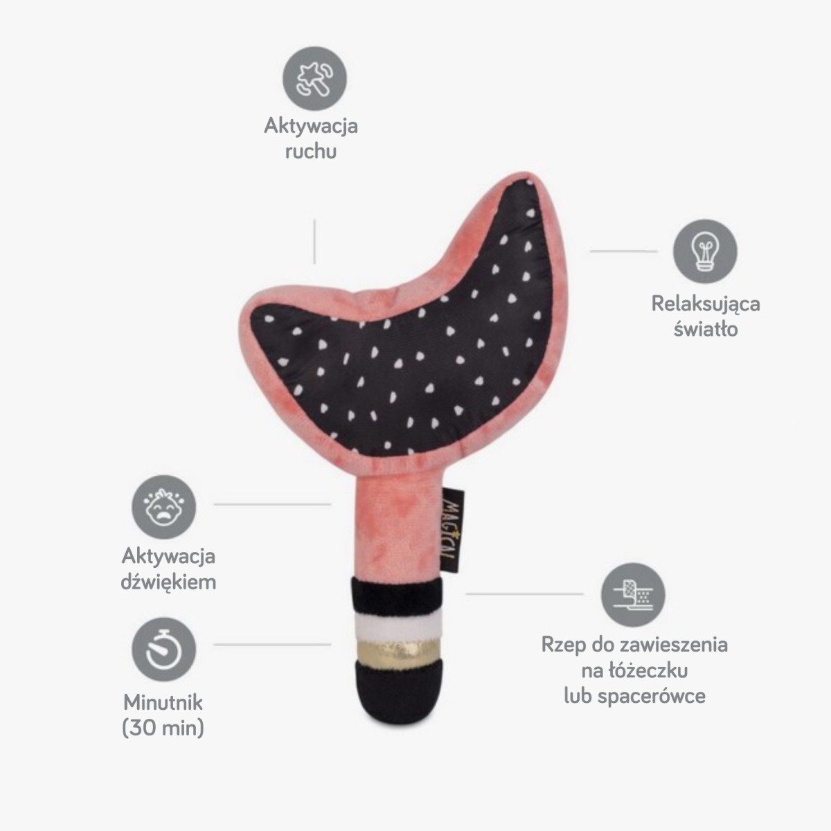 Miękka magiczna różdżka w kształcie księżyca z lampką nocną, która sprawi, która sprawi, że Twój maluch nigdy nie poczuje się samotny i nie będzie się bał ciemności. Koniec ze strachem przed ciemnością Ta fantastyczna magiczna różdżka w kształcie księżyca jest idealnym nocnym towarzyszem Twojego dziecka, ponieważ jej delikatne, relaksujące światełko uspokaja dziecko w ciemności, przywracając spokojny sen. Łatwa w czyszczeniu Ta miękka zabawka jest dla dziecka przyjemna w dotyku, a możliwość wyjęcia wewnętrznego modułu oznacza, że możesz ją prać w razie potrzeby. Różne tryby aktywacji w zależności od gustu dziecka Różdżka może być używana w trybie ciągłej pracy, w trybie ruchu, gdy dziecko nią potrząsa, jakby to była prawdziwa, magiczna różdżka lub w trybie aktywacji dźwiękowej, ponieważ zawiera czujnik wykrywający płacz dziecka. Tryb automatycznego wyłączania lub tryb ciągłej pracy Różdżkę można używać w trybie ciągłego światła lub można użyć trybu automatycznego wyłączania się po 30 minutach użytkowania. Posiada akumulator o długiej żywotności. Zawsze widoczna Posiada praktyczne zapięcie na rzep, dzięki któremu możemy ją przymocować do wózka, kojca, łóżeczka lub w innym miejscu, tak, by mogła zawsze towarzyszyć dziecku, gdziekolwiek się znajduje. Cechy: - Aktywacja ruchem - Aktywacja dźwiękowa - Białe światło - Timer (30 min) - Zapięcie na rzep do przymocowania na wózku, kojcu, itp. Informacje techniczne: - Czas ładowania - 2 godziny - Czas pracy - 6 godzin - Zasilacz - 5V, 500 mA - Bateria - akumulator 1xLi-ion 3.7V 500mAh Akcesoria: - USB - mini kabel USB DZIĘKI MAGICZNEJ RÓŻDŻCE KONIEC ZE STRACHEM!