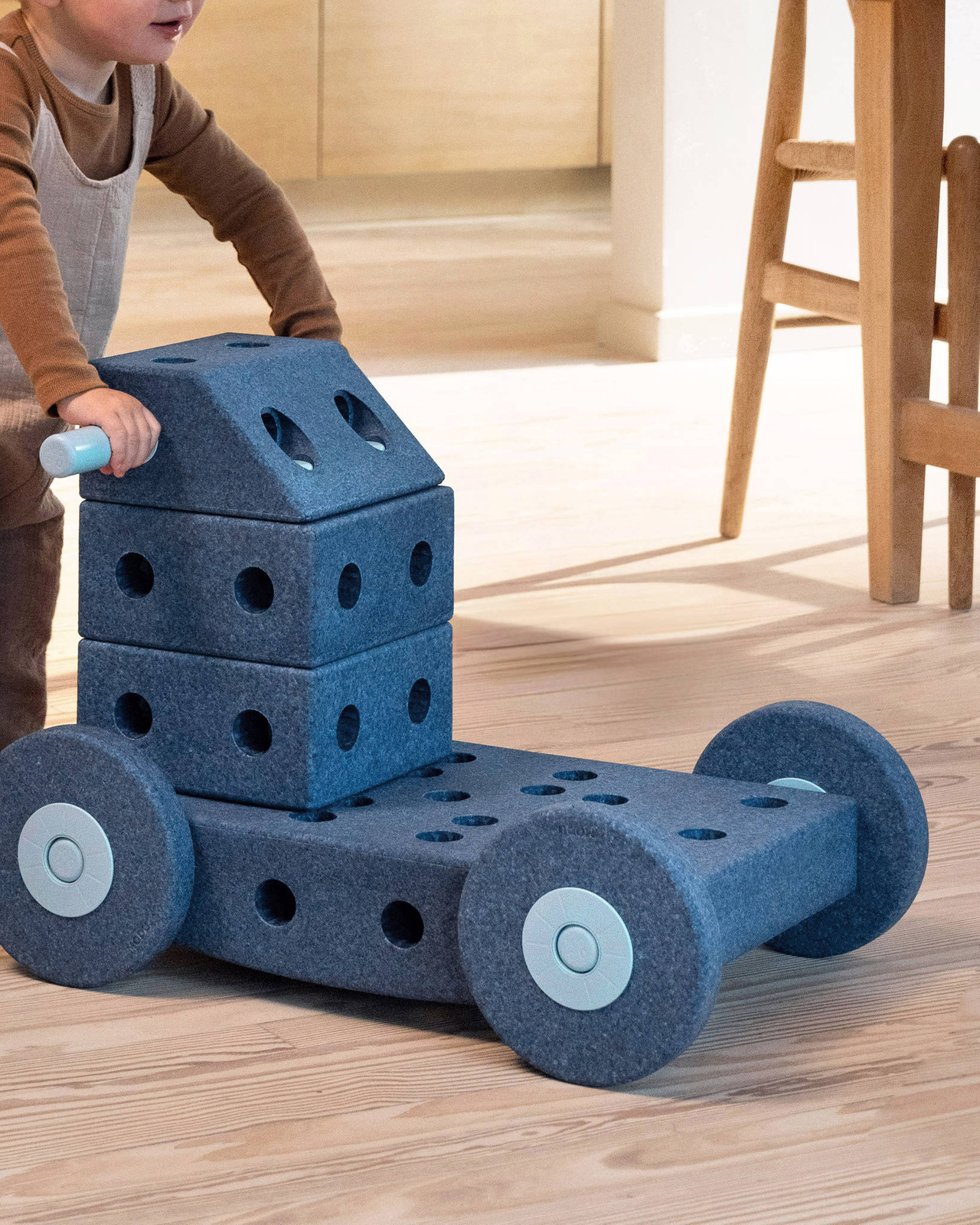 Gotowy, aby ulepszyć swojego konia na biegunach do zabawnego samochodu wyścigowego? Koła piankowe MODU są idealne do budowania stabilniejszych zabawek do jeżdżenia i pchania. Mogą również zastąpić palniki w zbudowanej kuchence do zabawy lub konsolę DJ-a. Przymocuj je do kołków łączących na dwa sposoby: jedna strona swobodnie się porusza, a druga sprawia, że koło turkoce.