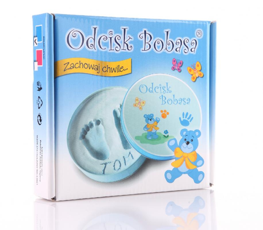 Zestaw składa się z ozdobnej puszki, w której umieszczona jest kolorowa masa gipsowa. Została ona tak przygotowana, aby było można w bardzo łatwy i szybki sposób przygotować ją do użycia, całkowicie samodzielnie. Wystarczy tylko wymieszać różową lub niebieską masę z zalecaną ilością wody, przełożyć do ozdobnej puszki, a następnie odczekać chwilę, aż zacznie tężeć. W tym momencie można już odcisnąć rączkę lub stopę Malucha oraz na spodzie wieczka wypełnić metryczkę, która zawiera miejsce na wpisanie imienia, wieku dziecka oraz datę zrobienia odcisku. Każdy z zestawów zawiera szczegółową instrukcję obsługi, dzięki czemu wykonanie masy do odcisku nie będzie stanowiło żadnego problemu. Wykonanie pamiątkowego odcisku rączki lub stopy Malucha z pewnością będzie doskonałą zabawą dla całej rodziny. Nasz „Odcisk Bobasa” to pomysł na świetną zabawę. Całość jest bardzo atrakcyjnie zapakowana w kolorowy kartonik, dzięki czemu nasz produkt idealnie się nadaje na prezent dla każdego Maluszka - dla chłopca w kolorze niebieskim, a dla dziewczynki w różowym.