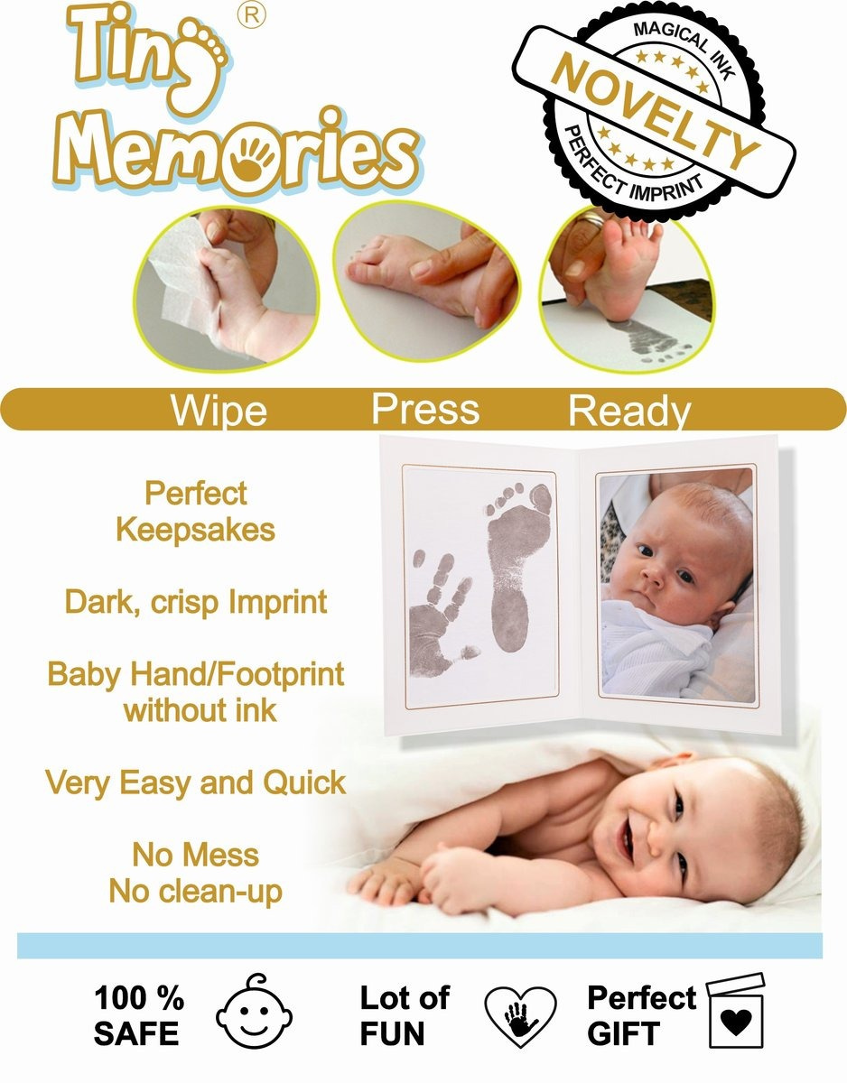 Marka Tiny Memories przedstawia zestaw do samodzielnego, szybkiego i niezwykle prostego wykonania pamiątkowego odcisku rączki i stópki nawet u bardzo małych dzieci. Nasz produkt stanowi foto ramka z magicznym atramentem, który będzie wspaniałą pamiątką na długie lata. Foto ramka na przodzie posiada pamiątkową metryczkę, w której umieścimy imię dziecka oraz datę wykonania odcisku. Odcisk wykonamy szybko, sprawnie i bez najmniejszego bałaganu za pomocą niewidzialnego atramentu. Specjalny atrament pozwoli na uzyskanie idealnie ostrego odcisku, zawierajacego każdą linie papilarną, każde załamanie skóry. Zestaw zawiera: wilgotną ściereczkę, specjalny papier do wykonania odcisku (2 arkusze), podwójną kartonową ramkę na zdjęcia w formacie 13x18 cm. Zestaw idealnie nadaje się na prezent. Klasyczne białe kolory dopasują się do każdego wnętrza, a samo wykonanie odcisku będzie wspaniałą zabawą. Zestaw zawiera szczegółową instrukcję obsługi. Produkt nie jest zabawką. Odcisk wykonuje osoba dorosła.