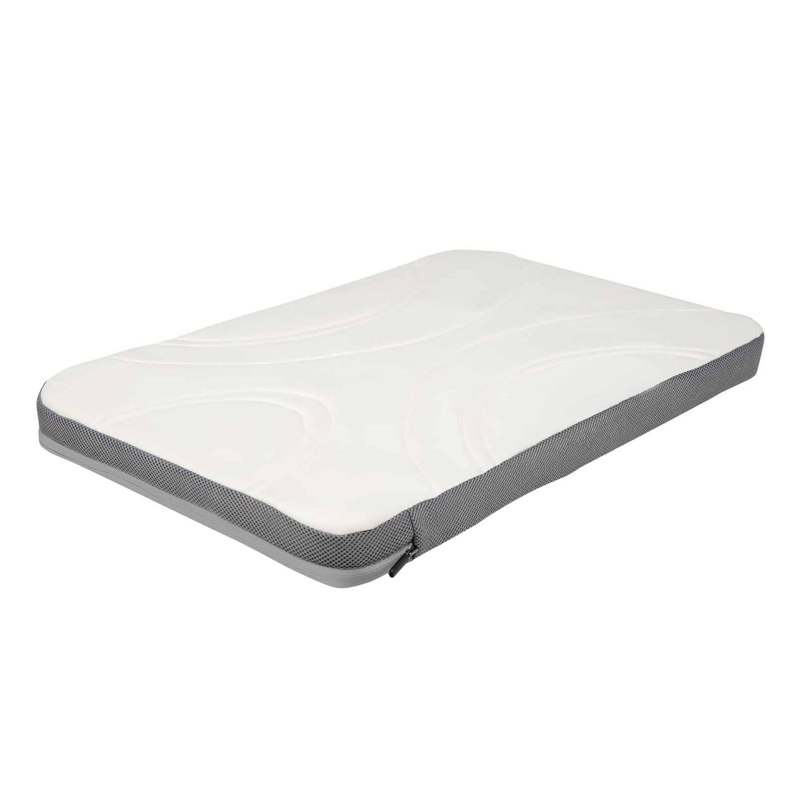 Łóżeczko dostawne wyposażone zostało w 5-centymetrowy, oddychający materac wraz z dolnym panelem umożliwiającym właściwą cyrkulację powietrza. Jest to gwarancja spokojnego i zdrowego snu. Nie zabrakło też siatki po obu stronach, będącej niezastąpionym sposobem na bezpieczeństwo oraz miłego, wewnętrznego nadruku, który zainteresuje malucha po przebudzeniu, a wieczorem zaprosi do dziecięcej krainy snu.