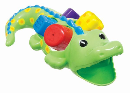 Kolorowy, sympatyczny aligator umili dziecku czas kąpieli. Maluch może wrzucać klocki przez grzbiet aligatora - ma za zadanie dopasować kształty do otworów lub karmić zwierzątko umieszczając klocki w pyszczku. Zabawkę można powiesić za ogon na prysznicu lub na pręcie od zasłony prysznicowej, co umożliwi szybkie wysuszenie.