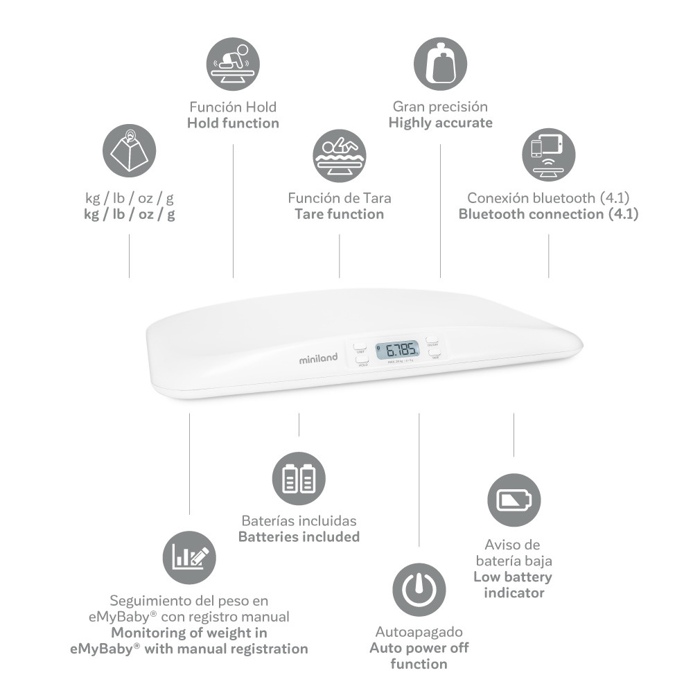 W kwestii ważenia niemowlęcia precyzyjny pomiar to podstawa. Kontroluj wagę dziecka w domu w łatwy sposób dzięki profesjonalnej wadze, którą można połączyć z aplikacją eMyBaby w telefonie. Precyzja, która pozwala kontrolować zmianę wagi dziecka na różnych etapach jego wzrostu, aż do 20 kg. Możesz połączyć się z aplikacją eMyBaby przez Bluetooth, dzięki czem łatwo rejestrujesz dane. Posiada cyfrowy wyświetlacz, funkcję zatrzymania (do ważenia poruszającego się dziecka) i funkcję tarowania, ponadto posiada ostrzeżenie o niskim poziomie baterii i funkcję oszczędzania energii. Waga automatycznie wyłącza się po minucie nieużywania, oszczędzając w ten sposób energię i zapewniając dłuższą żywotność baterii. Cechy: Maksymalna waga do 20 kg dokładność pomiaru - przydatne dla noworodków lub dzieci, które mają problem z wagą funkcja HOLD - automatyczne wyrównanie pomiaru gdy dziecko się porusza informacja o niskim stanie baterii i konieczności jej wymiany funkcja tarowania - pozwala na zważenie dziecka wraz z innymi przedmiotami, wyświetlony pomiar nie będzie uwzględniał wagi przedmiotów cyfrowy wyświetlacz wskaźnik przekroczenia maksymalnej wagi monitorowanie wagi w aplikacji eMyBaby® za pomocą ręcznej rejestracji wyników automatyczne wyłączanie po minucie.