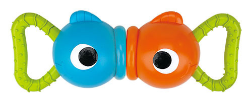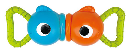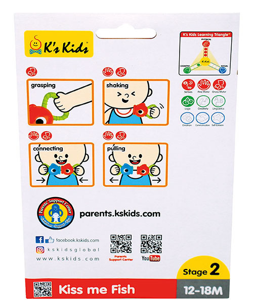 Wybierz właściwe zabawki rozwojowe dla Twojego dziecka. Dwie urocze rybki sprawią, że Twoje dziecko będzie się świetnie bawić oraz rozwinie wiele umiejętności w jednym czasie. Rybki są wyposażone w magnesy, dzięki czemu dziecko może łatwo je ze sobą połączyć. Zabawka posiada również gryzak, więc idealnie sprawdzi się podczas ząbkowania maluszków oraz w celu uspokajającym. Każdy element zabawek K's Kids jest zaprojektowany w taki sposób, aby wspomóc prawidłowy rozwój dzieci. Aby łatwiej było zrozumieć rodzicom, jakie zalety zawierają zabawy z produktami K's Kids, stworzono Trójkąt Umiejętności, który pokazuje czego dziecko potrzebuje dla prawidłowego rozwoju fizycznego, poznawczego oraz społecznego. Trójkąt Umiejętności to prosty przewodnik dla rodziców, pokazujący jakie umiejętności zdobywa lub rozwija dziecko w czasie zabawy daną zabawką i znajduje się na każdym opakowaniu produktów. Część zabawek jest zaprojektowana z myślą o rozwoju kilku sfer, inne mają za zadanie kształtować ich większą ilość-w zależności od potrzeb i możliwości dzieci znajdujących się na różnych etapach rozwoju. Jakie umiejętności może rozwinąć Twoje dziecko, podczas zabawy z rybkami? Rozwój fizyczny zmysły - pobudzają ciekawość dziecka i zachęcają je do odkrywania rzeczy znajdujących się dookoła niego. Zabawki stymulujące zmysły są niezwykle ważne we wczesnym okresie rozwoju dziecka motoryka mała - rozwija precyzyjne i kontrolowane ruchy, wraz z mimiką twarzy, koordynację wzrokowo-ruchową oraz prawidłową artykulację wyrazów motoryka duża - to ruchy większych mięśni odpowiedzialnych za pracę ramion, nóg, stóp lub całego ciała. Zabawki zachęcają dziecko do kopania, raczkowania, biegania lub skakania Rozwój poznawczy umiejętności logiczne - umożliwiają dzieciom łączenie skrawków informacji. Zabawki, takie jak układanki czy klocki, mogą wzmocnić dziecięcą inteligencję, układania w kolejności, koncentracji, argumentacji i rozwiązywania problemów. Etap 2 (2-18M): Cel: Ćwiczenie motoryki małej i dużej - chwytanie i potrząsanie. Metoda: Zachęć dziecko do łapania i potrząsania zabawką raz jedną, raz drugą ręką. Cel: Ćwiczenie motoryki dużej - łączenie rybek ze sobą. Metoda: Rybki posiadają magnes, który przyciąga je do siebie. Zachęć dziecko do połączenia rybek ze sobą. Cel: Ćwiczenie motoryki dużej - rozdzielanie rybek. Metoda: Rybki posiadają magnes, który przyciąga je do siebie. Zachęć dziecko do rozdzielenia rybek. Cel: Pobudzanie zmysłów - dotykanie i odczuwanie różnych struktur. Metoda: Zachęć dziecko, aby dotknęło wypukłych części na gryzaku. Cel: Trening poznawczy - nauka o rybkach. Metoda: Rozwijaj u dziecka wiedzę o rybkach.