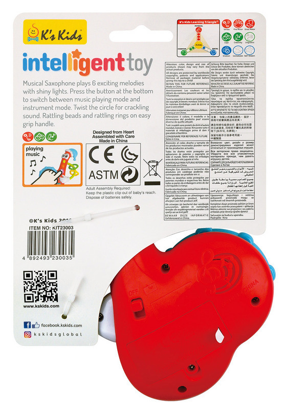 Doradca Rozwoju Dziecka >> Wybierz właściwe zabawki rozwojowe dla Twojego dziecka. Muzyczny saksofon gra 6 ekscytujących melodii oraz posiada efekty świetlne. Naciśnij przycisk na dole, aby przełączyć się pomiędzy trybem muzycznym a trybem instrumentu. Przekręć kółkiem, aby usłyszeć dźwięki. Zabawka posiada łatwy do złapania przez dziecko uchwyt, a dzięki koralikom w środku, może także służyć jako grzechotka. Każdy element zabawek K's Kids jest zaprojektowany w taki sposób, aby wspomóc prawidłowy rozwój dzieci. Aby łatwiej było zrozumieć rodzicom, jakie zalety zawierają zabawy z produktami K's Kids, stworzono Trójkąt Umiejętności, który pokazuje czego dziecko potrzebuje dla prawidłowego rozwoju fizycznego, poznawczego oraz społecznego. Trójkąt Umiejętności to prosty przewodnik dla rodziców, pokazujący jakie umiejętności zdobywa lub rozwija dziecko w czasie zabawy daną zabawką i znajduje się na każdym opakowaniu produktów. Część zabawek jest zaprojektowana z myślą o rozwoju kilku sfer, inne mają za zadanie kształtować ich większą ilość-w zależności od potrzeb i możliwości dzieci znajdujących się na różnych etapach rozwoju. Jakie umiejętności może rozwinąć Twoje dziecko, podczas zabawy z saksofonem? Rozwój fizyczny zmysły - pobudzają ciekawość dziecka i zachęcają je do odkrywania rzeczy znajdujących się dookoła niego. Zabawki stymulujące zmysły są niezwykle ważne we wczesnym okresie rozwoju dziecka motoryka mała - rozwija precyzyjne i kontrolowane ruchy, wraz z mimiką twarzy, koordynację wzrokowo-ruchową oraz prawidłową artykulację wyrazów motoryka duża - to ruchy większych mięśni odpowiedzialnych za pracę ramion, nóg, stóp lub całego ciała. Zabawki zachęcają dziecko do kopania, raczkowania, biegania lub skakania Rozwój poznawczy umiejętności logiczne - umożliwiają dzieciom łączenie skrawków informacji. Zabawki, takie jak układanki czy klocki, mogą wzmocnić dziecięcą inteligencję, układania w kolejności, koncentracji, argumentacji i rozwiązywania problemów Rozwój społeczny emocje - zdrowe dziecko powinno być w stanie wyrażać i kontrolować swoje emocje. Świadomość bycia kochanym i chronionym rozwija jego poczucie bezpieczeństwa. Zabawki, które mogą stać się przyjacielem dziecka i pomóc mu w wyrażaniu uczuć, spełniają bardzo ważną rolę w procesie uczenia się jak efektywnie kontaktować się z innymi, z obopólnym zaufaniem. Poniżej przedstawiamy poszczególne etapy rozwijające umiejętności dziecka, w zależności od wieku: Etap 1 (3-9m): Cel: ​Stymulacja zmysłów - dotyk i czucie. Metoda: Zachęć dziecko do dotykania różnych tekstur zabawki i użycia gryzaka. Cel: ​Ćwiczenie motoryki małej - chwytanie. Metoda: Zachęć dziecko do chwytania elementów zabawki raz jedną, raz drugą ręką. Cel: ​Stymulacja wzroku i ćwiczenie motoryki dużej - potrząsanie. Metoda: Zachęć dziecko do potrząsania rybką i słuchania wydobywanego się dźwięku. ​ Baterie: 2 x AAA (niezałączone).