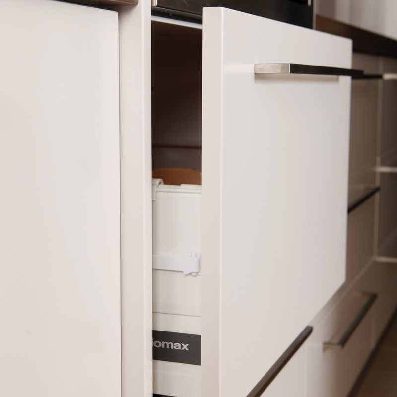 Rośnij bezpiecznie! pasuje do większości szuflad na szynach, szybko i łatwo zabezpiecza szuflady, pasuje zarówno do górnych jak i dolnych szuflad z minimalnym odstępem 11mm (0.43”) pomiędzy zewnętrzną krawędzią szuflady a wnętrzem szafki.