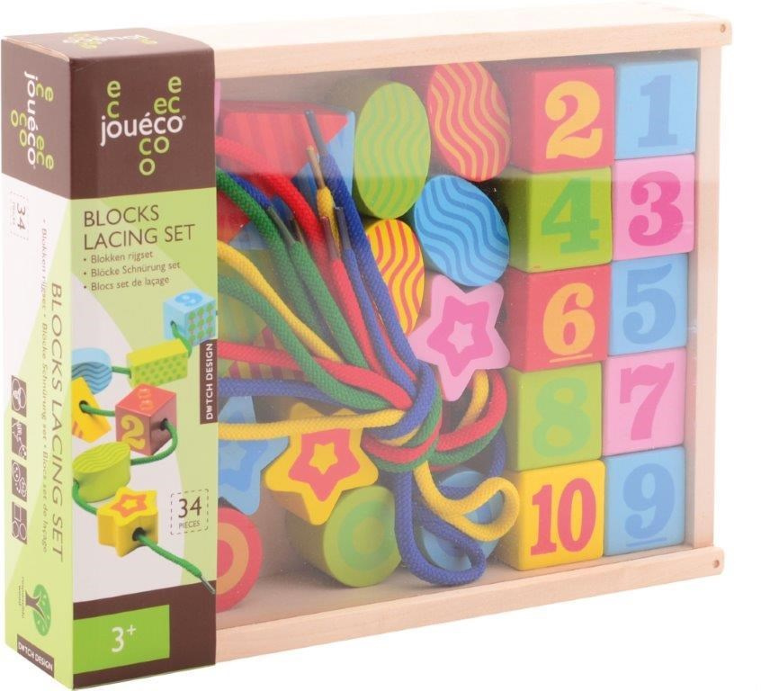 Zestaw zawiera 34 elementy – drewniane kolorowe klocki o różnych kształtach, kolorowe sznurki do nawlekania, wszystko zapakowane w drewniane pudełko. Niektóre klocki oznaczone są cyferkami od 1 do 10 i pokazują też odpowiednią liczbę przedmiotów, aby nauczyć dziecko rozpoznawania cyfr i liczenia. Kolorowe sznurki zakończone są jak sznurowadła, dzięki czemu dziecko poprzez zabawę uczy się zręczności i dodatkowo przygotowuje do nauki pierwszego wiązania bucików. Klocki mają różne kształty dzięki czemu można układać z nich interesujące wzory i za każdym razem tworzyć inną kompozycję. Są dobrym ćwiczeniem motorycznym dla dziecka i promuje koordynację ręka-oko, uczą zręczności, cierpliwości i wzbogacają wyobraźnię