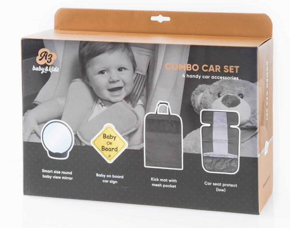 Zestaw samochodowy COMBO 4w1 składa się z niezbędnych 4-ech produktów: ochraniacze/organizery zarówno tylnego jak i przedniego fotela, poręczne regulowane lusterko oraz tabliczka informacyjna „Baby on board”. Jest to idealny zestaw, który sprawi, że Twój samochód będzie bezpieczny dla dziecka i utrzymany z czystości podróżując z małym pasażerem.